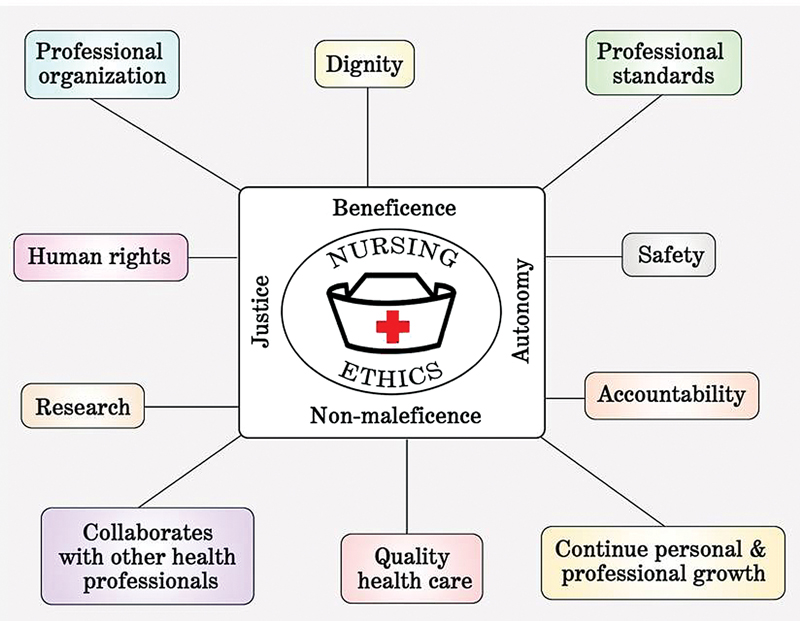 Nurses are important members of society because of the unique tasks they do in promoting health, preventing sickness and injury, assisting in rehabilitation, and offering support to patients in need in both hospital and community setups.[1] Nurses' primary concern is holistic health, which includes the physical, social, emotional, and spiritual requirements of their patients, and they work relentlessly to advance their patients' best interests.[1] They play a key role in ensuring everyone's well-being across the spectrum of positive health and are involved in the therapeutic decision-making process to advocate for and provide advice to the patients and their family caregivers. On a daily basis, nurses face a lot of ethical dilemmas in clinical practice, and their judgments must be guided by moral principles. Nurse, as a crucial stakeholder in health care delivery, should adhere to these principles when dealing with patients, their families or caregivers, and other health care professionals and the following principles as a set of guideline.[1]