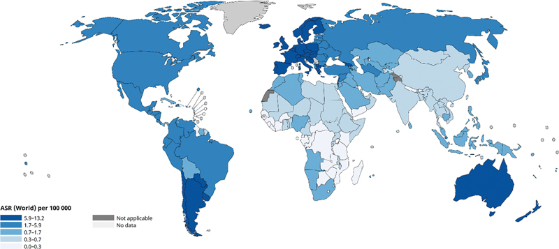 | Fig 1 :Age-standardized rate (world) per 100,000, incidence of testicular cancer as per GLOBOCAN 2022.