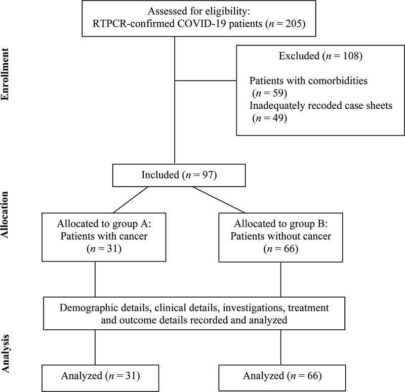 A total of 205 admitted pediatric patients with RTPCR confirmed COVID-19 infection were screened for enrolment in this study. Patients with comorbidities other than cancer (n = 59) and those with inadequately recorded case sheets (n = 49) were excluded. Final analyses were performed on 97 patients out of which 31 children were classified into group A (children with cancer) and 66 into group B (children without any comorbidity). The study flow is shown in [Fig. 1].