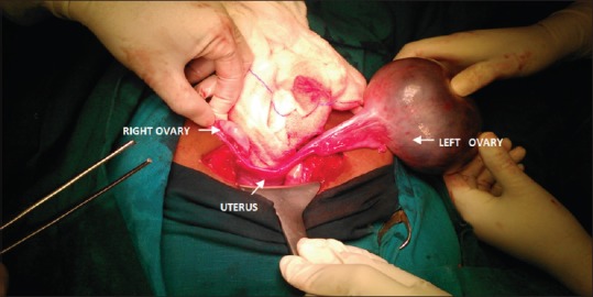 The patient was taken for laparotomy. On opening the abdomen, the uterus was very small in size, right ovary was normal, and a left ovarian cyst 8 cm in size with smooth surface [Figure 1] was found. An ovarian cyst in an 8-year-old girl may also have some malignant potential, so ovariotomy was done. The patient stood the procedure well. Histopathological examination of the specimen revealed uniloculated cyst with one tiny solid area. Wall thickness was 0.2 cm. The solid area showed tuft of hair and pultaceous material. Features were suggestive of mature cystic teratoma.