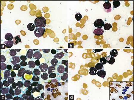 A 14-year-old Indian male presented with extreme fatigue and myalgia for 1 month. He was afebrile and had marked pallor and hepatomegaly. Hemogram revealed hemoglobin of 49 g/L, platelets of 127 × 109/L, and leukocytes of 15.8 × 109/L. Myeloperoxidase (MPO)-negative blasts comprised 75% of circulating leukocytes and 96% of bone marrow nucleated cells. These blasts were 2–4 times the size of a mature lymphocyte, had opened up chromatin and scanty basophilic cytoplasm. Multiple cytoplasmic vacuolations were observed in 88% of the blasts, and 12% of blasts showed erythrophagocytosis or thrombophagocytosis or cannibalism [Figure 1]. Flow cytometric immunophenotyping (FCI) was consistent with B-ALL with aberrant myeloid lineage marker [removed]CD19moderate, CD10bright, HLA-DRmoderate, CD34dim to moderate, CD13moderate, CD33moderate, CD36negative to dim, cytoplasmic CD79amoderate, cytoplasmic CD22moderate, cytoplasmic MPOnegative, and cytoplasmic CD3negative). Qualitative reverse-transcriptase-polymerase chain reaction revealed ETV6-RUNX1 fusion transcript positivity. There was no leukemic central nervous system infiltration at diagnosis.
