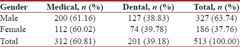 Out of the 535 practitioners, 513 practitioners participated in the study with a response rate of 95.88%. Table 1 shows the majority of the participants in this study to be males (63.74% [n = 327]) and only 36.25% (n = 186) to be female respondents.