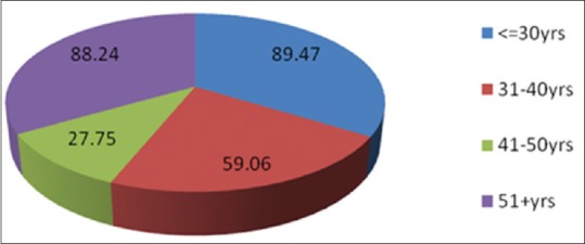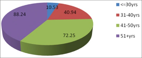 Figures Figures11 and and22 show the majority of MPs to be in the age group of 51 years and above (88.24%) and majority of DPs to be in the age group of 31–40 years (89.47%). The mean age of MPs was 47.23 ± 8.12 and that of DPs was 38.17 ± 7.90.
