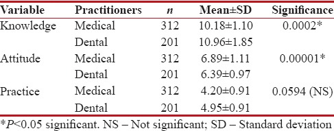 Comparison of medical and dental practitioners with respect to knowledge, attitude, and practice scores