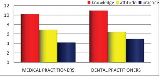 | Figure 3:Comparison of medical and dental practitioners with respect to knowledge, attitude, and practice scores