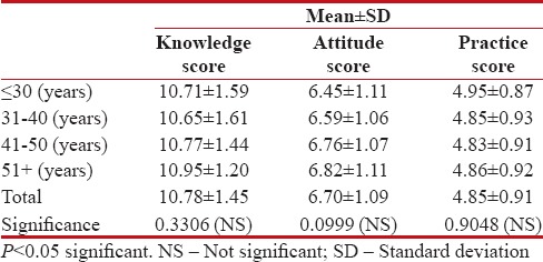 Comparison of age groups of practitioners with respect to knowledge, attitude, and practice scores