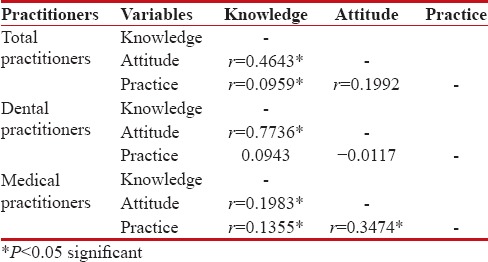 It was seen in this study that the knowledge and attitude scores and, knowledge and practice scores for both the group of practitioners were significantly correlated. The knowledge and attitude scores were significantly correlated for the DPs, and the knowledge and attitude scores and, knowledge and practice scores were significantly correlated for the MPs as shown in Table 4.