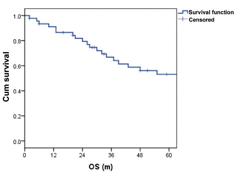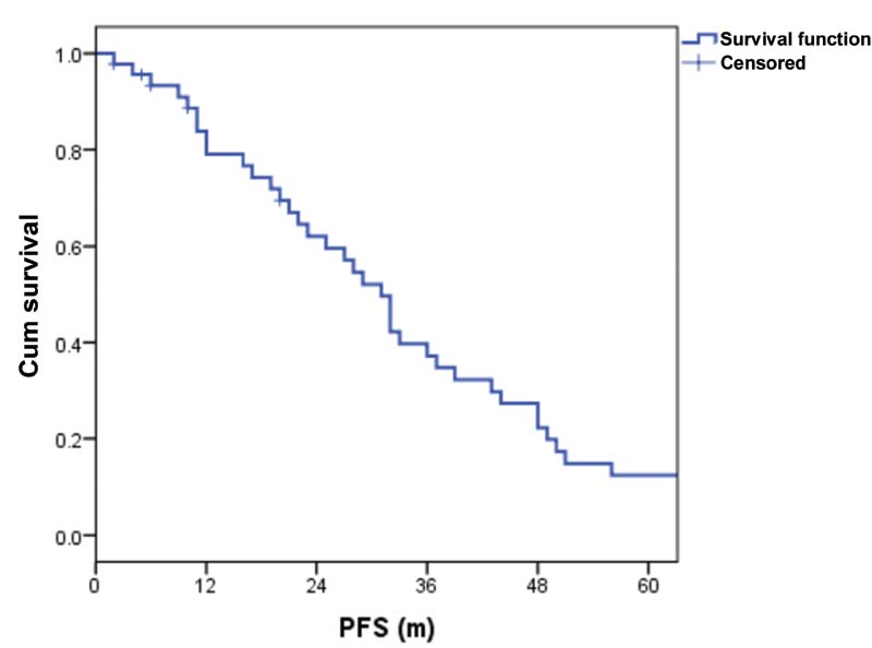 The categorical variables are expressed in frequency and proportion. The continuous variables are summarized using mean and standard deviation. The OS and PFS are estimated using Kaplan–Meier method and association of survival with comparator parameters is tested using logrank test. The risk is estimated using Cox Regression. A p-value of <0>