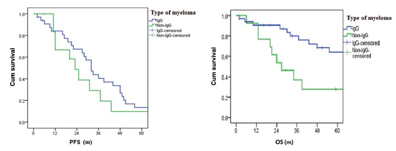 | Figure 3:(A) Progression-free survival (PFS) versus type of myeloma. (B) Overall survival versus type of myeloma (OS). IgG, immunoglobulin G.