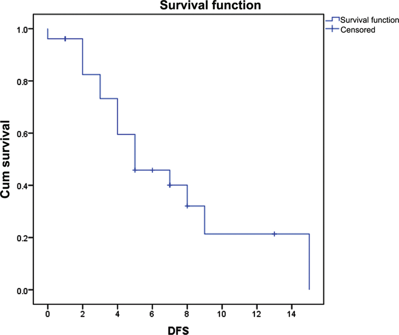 | Fig. 1 The disease-free survival (DFS) for the study group was 5 months (95% confidence interval: 1.78–8.21).