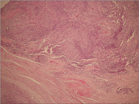 |?Figure. 1? Low-power view showing intramyometrial cellular malignant neoplasm (H and E, ?40)