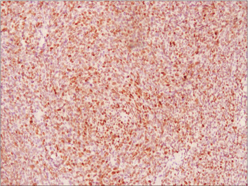 |?Figure. 2? Immunohistochemistry: photomicrograph showing tumor cells diffusely positive for Cyclin D1. (IHC, ?100)