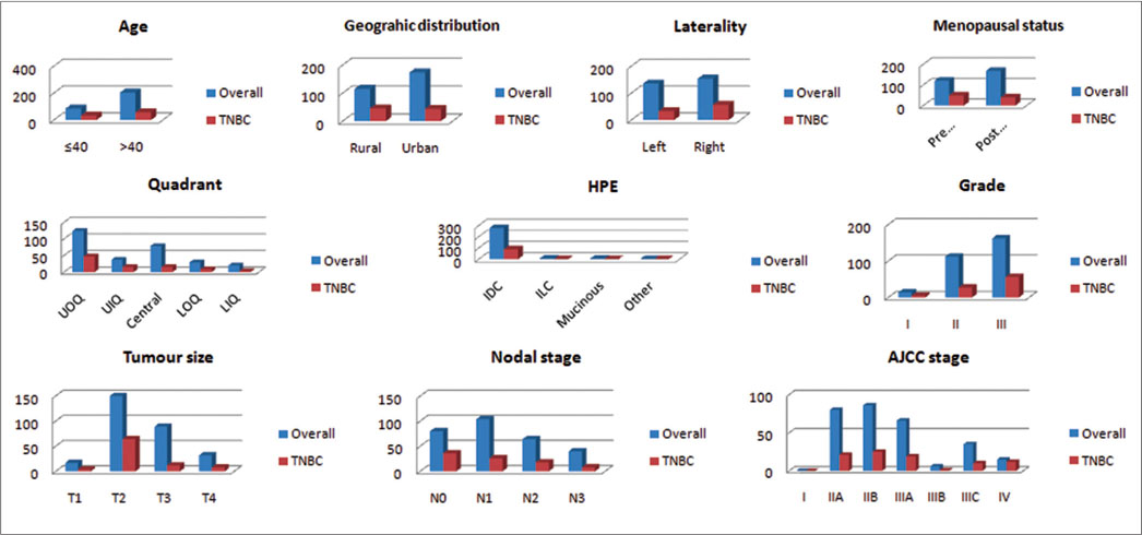 Baseline patient and tumor characteristics are shown in [Table 1] and [Figure 1]. Most of the patients were older than 40 years, postmenopausal belonging to the urban background. Most of the tumors were right sided, situated in upper outer quadrant, infiltrating ductal carcinoma (IDC), not otherwise specified on histopathological examination (HPE), Grade III, and American Joint Committee on Cancer (AJCC) stage IIB.