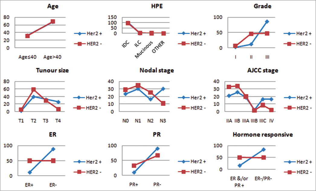 The present study was carried out on female breast cancer patients registered in the department of Radiotherapy, SMS Medical College and Hospital, Jaipur; during year 2015?2016 with histopathologically proven diagnosis of invasive breast cancer and a pathology review available from our institute. A total of 288 patients were found eligible. Various patients?, tumor- nd treatment-related parameters were recorded after obtaining consent from the patient. The biopsy was analyzed immunohistochemically for ER, PR, and HER2/neu expression. Equivocal HER2 (2+) was further confirmed by fluorescent?in situ?hybridization (FISH) assay. Number of patients who actually received HER2/neu-targeted therapy (trastuzumab and/or lapatinib) among eligible ones was also studied. The biopsy sample analyzed for hormone receptor status was the initial one, before any chemotherapy, targeted therapy, definitive surgery, radiotherapy, or hormonal therapy. For the new cases reporting in the department, biopsy was taken and sample was analyzed at our institute. For the postoperated-referred patients with the history of neoadjuvant chemotherapy, the prechemo biopsy sample was analyzed at institute and such patients were included only if the material was found to be adequate at least for ER/PR analyses. Cases without initial prechemo sample or with inadequate sample for proper review were excluded from the study. All those patients with equivocal HER2/neu (2+ on immunohistochemistry [IHC]) who denied for FISH analysis were also excluded from the study.