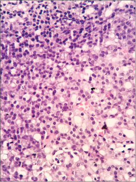 |?Figure. 5? Low power (?10) view of hematoxylin- and eosin-stained section of round to polygonal tumor cells with basophilic granular cytoplasm with hyperchromatic nucleus and inconspicuous single nucleoli