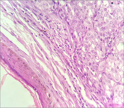 |?Figure. 6? 40X view of Haematoxylin & Eosin stained section showing nests of tumor cells beneath the epidermis of skin