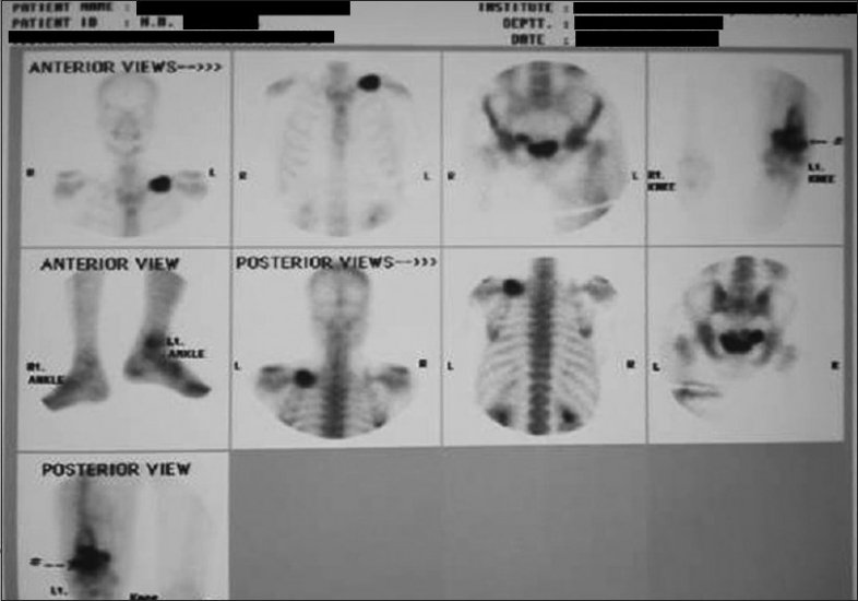 | Figure 3 Whole-body bone scan using Tc 99 m showing increased uptake by left clavicle and distal third of left femur