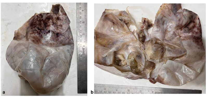 | Fig 1 : (a, b) Gross image shows an ovarian mass measuring 18 × 15 × 10 cm, with the cut section showing clear cystic areas and focal solid areas.