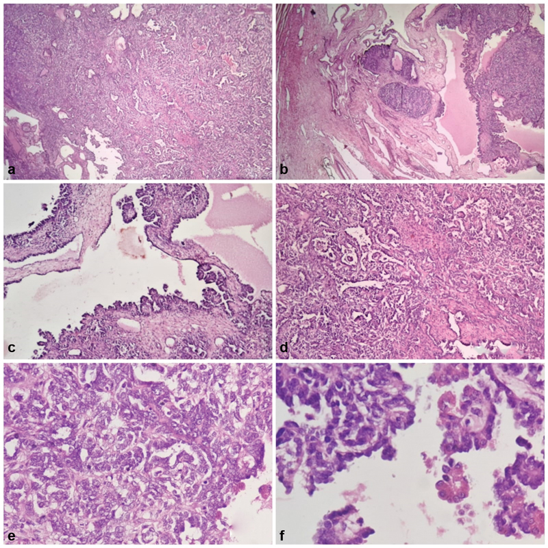A 5-year-old girl presented to the pediatric outpatient department (OPD) with periumbilical abdominal pain for 9 months. Recently, she also experienced loss of appetite and few episodes of nonprojectile vomiting; however, she denied history of fever. Her bowel and urine habits were normal. Family history was unremarkable. General examination revealed no abnormality. She showed normal growth and development according to her age and sex. On per abdominal examination, there was mild abdominal distension with tenderness in the periumbilical region. The rest of the systemic examinations were within normal limits. With the clinical differential of persistent chronic infection, she was referred for ultrasonography (USG) of the abdomen and pelvis, which showed the presence of a 15 × 10 cm complex abdominal mass suspicious of ovarian neoplasm. The rest of her basic biochemical parameters were within normal parameters. All the serological markers performed were within normal limits, including Alpha fetoprotein (AFP), Lactate dehydrogenase (LDH), Human chorionic gonadotrophin (β-HCG), Cancer antigen 125 (CA125) preoperatively. Computed tomography (CT) scan of the abdomen and pelvis revealed a hypodense solid-cystic mass coming from the pelvis measuring 15 × 10 cm possibly indicative of malignant ovarian neoplasm. With a radiographic diagnosis of right-sided complex tubo-ovarian mass, exploratory laparotomy was planned. Contralateral left side ovary was normal. Excised tubo-ovarian mass was then sent for histopathological examination. No nodal involvement was seen intraoperatively. Grossly, we received an ovoid mass measuring 18 × 15 × 10 cm. The cut section showed clear fluid with complex cysts and focal warty areas ([Fig. 1]). Microsection from the solid and cystic areas showed focal papillary projections lined by neoplastic epithelial cells with the surrounding fibrocollagenous stroma ([Fig. 2a, b]). Solid nodular areas showed hyperchromatic pleomorphic neoplastic epithelial cells, with mild to moderate nuclear pleomorphism having prominent central nucleoli at few places ([Fig. 2c–f]). The mitotic index was 10/10 HPFs (high power fields). However, there was no evidence of necrosis, or high-grade nuclear features, hence indicative of a low-grade neoplasm. With the above histomorphological features, a diagnosis of low-grade papillary serous cystadenocarcinoma was made. Immunohistochemistry (IHC) was done for confirmation of the same findings. It showed nuclear positivity for Wilms tumor protein (WT1), estrogen receptor (ER) and wild type expression of P53 ([Fig. 3a–c]) and negative P16 [removed][Fig. 3d]). The patient was referred to a higher oncology center for further treatment; however, she was lost to follow-up.