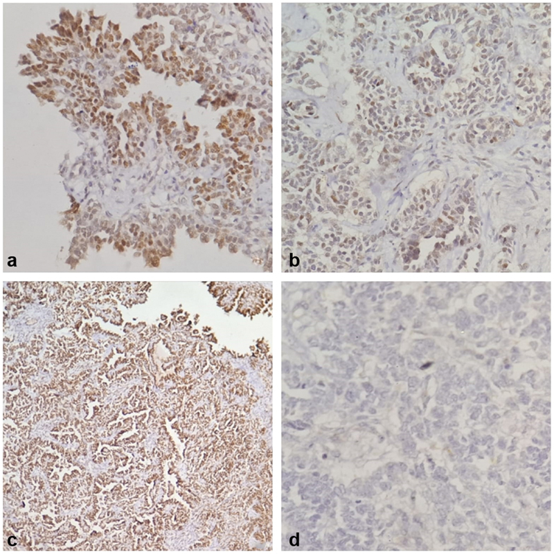 | Figure 3: (a) Estrogen receptor (ER) shows strong nuclear positivity in tumor cells (immunohistochemistry [IHC], 400x). (b) p53 shows wildtype expression in tumor cells (IHC, 400x). (c) WT1 shows strong nuclear positivity in tumor cells (IHC, 100x). (d) p16 shows negative in tumor cells (IHC, 400x).