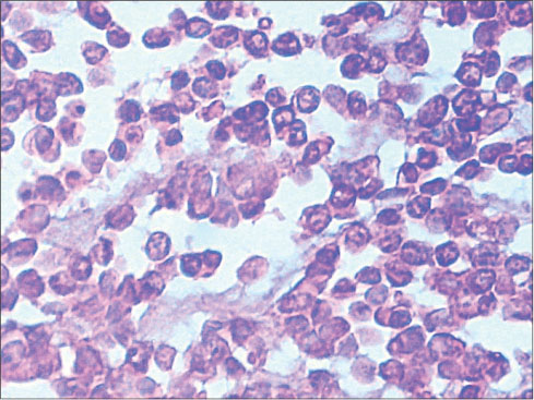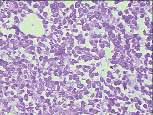 |?Figure. 2? Tumor cells with round nuclei with stippled chromatin and increased N: C ratio (H and E, ?400)