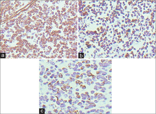 |?Figure. 3? Tumor cells showing positivity for synaptophysin. (b) Tumor cells showing positivity for neuron-specific enolase. (c) Tumor cells showing positivity for cytokeratin