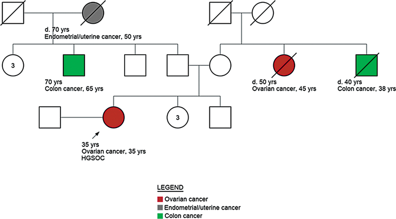 However, a more detailed inquiry changes the picture. The patient recalls an extended family history: a maternal aunt was diagnosed with ovarian cancer at age 45, maternal uncle had colon cancer at 38, another paternal uncle had colon cancer at age 65, and paternal grandmother had endometrial cancer at age 50. These additional clues—ovarian, colon, and endometrial cancer on both the side of the family—are red flags for Lynch syndrome (hereditary nonpolyposis colorectal cancer). Lynch syndrome often involves colon, endometrial, ovarian, and other cancers across generations. Notably, having two or more relatives in the family with Lynch-associated cancers (e.g., one with endometrial, another with colorectal cancer, and another with ovarian cancer) greatly increases suspicion for this syndrome. The patient's first-degree relatives were cancer-free, but her second- and third-degree relatives suggested a pattern ([Fig. 2]).
