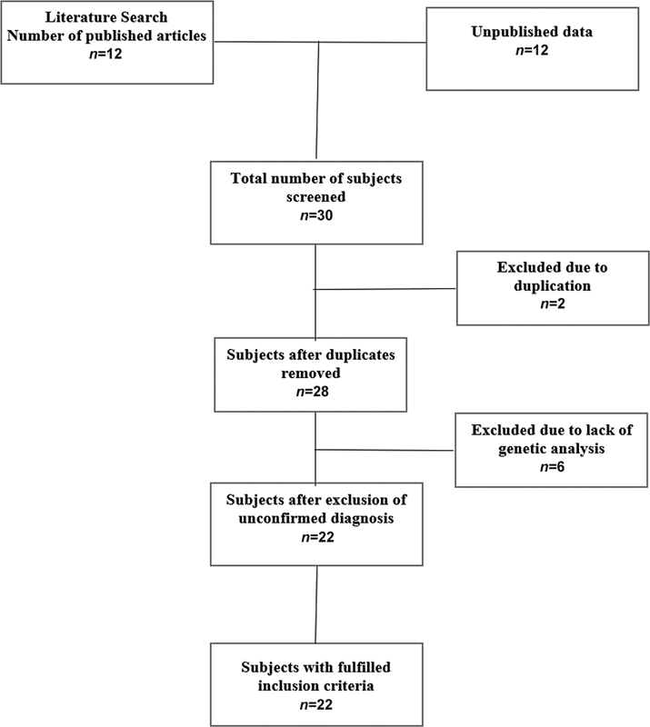 Duplicate publications and cases with no confirmatory genetic study were excluded.