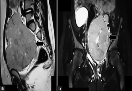 | Figure 1:Magnetic resonance imaging (a - sagittal view, b - coronal view) demonstrated a large pelvic mass (arrows in a and b). The left sided ovary was not distinctly identified. The uterus and urinary bladder were displaced and compressed by the mass