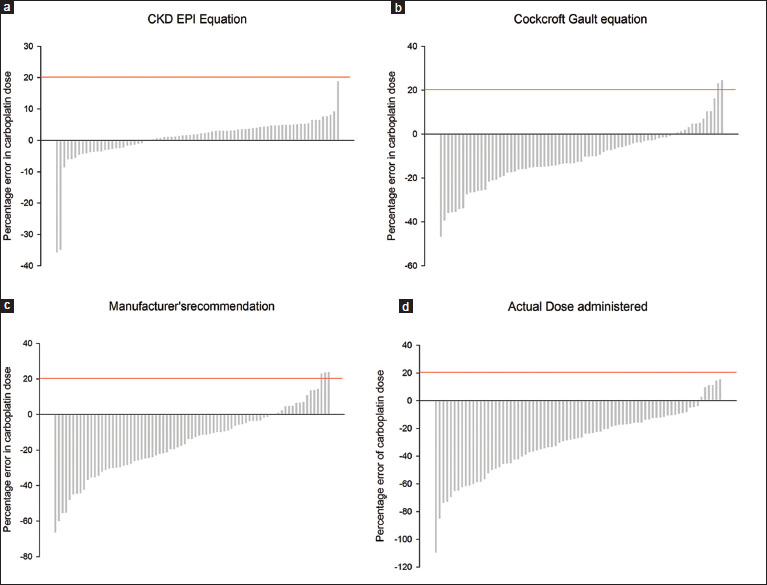 | Figure 1 Waterfall plot shows the percentage error in the carboplatin dosage along Y-axis (each bar represents one patient); (a) dose calculated as per the Chronic Kidney Disease Epidemiology Collaboration equation, (b) dose estimated by the Cockcroft–Gault equation, (c) dose estimated as per the carboplatin manufacturer’s recommendations, and (d) the dose which the patients actually received at our center. The comparator in all these plots was the dosage calculated as per the reference standard (glomerular filtration rate based on the new equation proposed by Janowitz et al.). Red line marks the 20% excess dose from the reference dosage|