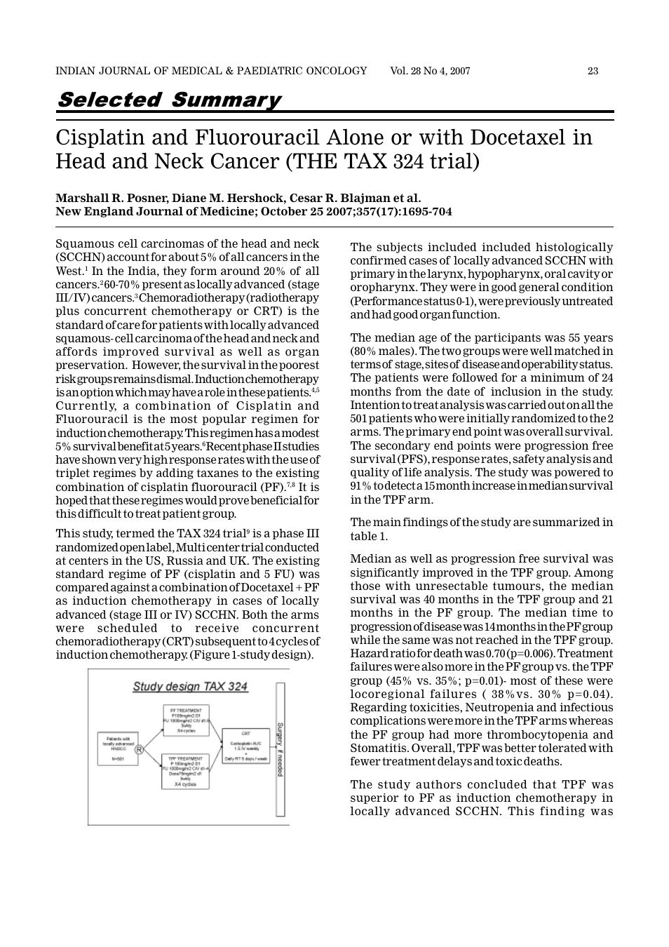Posner MR, Hershock DM, Blajman CR, et al. Cisplatin and fluorouracil alone or with docetaxel in head and neck cancer. N Engl J Med 2007;357:1705- 1715.