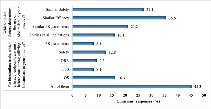 Several clinical factors were found to influence the adoption of biosimilars in clinical practice among the clinicians who participated in this survey. A significant proportion of respondents (35.6%) identified similar efficacy as the most important factor, followed by similar safety (27.1%) and similar pharmacokinetic (PK) parameters (21.2%), similar to their reference standard. Only 16.1%. of clinicians considered data from studies across all indications as a priority while prescribing biosimilars. Additionally, 45.3% of clinicians reported requiring a comprehensive evaluation across multiple efficacy endpoints before considering biosimilar use. Among individual parameters, 16.3%. considered overall survival (OS), while 12.8%. chose safety. Additional key factors included an overall response rate (ORR) of 9.3%, progression-free survival (PFS) of 8.1%, and PK parameters at 8.1%. ([Fig. 1]).
