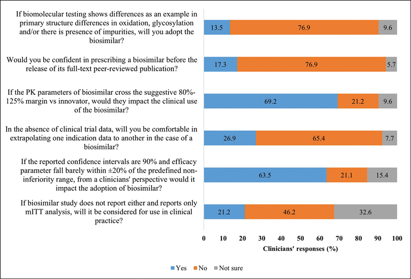 The presence of structural differences in biosimilars, such as oxidation or glycosylation issues, contributed to increased resistance among clinicians. A significant proportion of respondents (76.9%) rejected biosimilars with biomolecular deviations—defined as primary structural differences from the reference biologic—while only 13.5%. were willing to proceed with their use. A majority of respondents (65.4%) opposed the extrapolation of biosimilar data across indications without supporting clinical trial data. 26.9%. supported extrapolation, and 7.7%. were unsure. Before peer-reviewed publication, the majority of clinicians (76.9%) lacked confidence in prescribing biosimilars, while 17.3%. expressed comfort and 5.7% remained uncertain ([Fig. 2]).