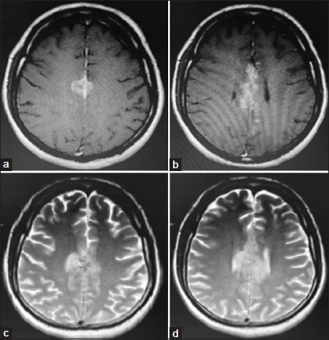 | Figure. 1(a and b) T1-weighted images showing intermediate signal lesions. (c and d) T2-weighted images showing hyperintense lesions