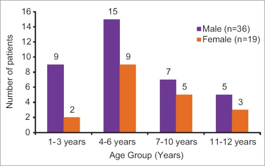| Figure 1Age and gender distribution of children with β thalassemia major reporting at a tertiary care teaching hospital (n = 55)