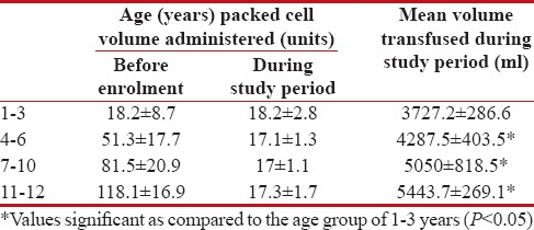 All the enrolled patients received packed cell volume (PCV) BTs. The patients received a total of 956 BTs during the study period (an average of 1.93 BTs per patient per month). The mean volume of blood transfused was significantly lower in patients of all age group of 1–3 years as compared to other age groups (P < 0 href="https://www.ncbi.nlm.nih.gov/pmc/articles/PMC5582544/table/T1/" target="table" class="fig-table-link figpopup" rid-figpopup="T1" rid-ob="ob-T1" co-legend-rid="" xss=removed>Table 1]. Adherence to BT guidelines (Indian Academy of Paediatrics [IAP], 2006) was observed in both splenectomized (n = 9) (mean volume of 4444.4 ± 1210.7 ml; an average of 131.8 ml/kg/year) and nonsplenectomized patients (n = 46) (mean volume of 4345.4 ± 1673.4 ml; an average of 180.3 ml/kg/year).