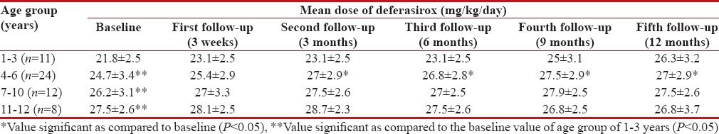 In the present study, the mean number of BTs received was higher in age groups of more than 3 years at baseline as compared to children aged 1–3 years. A significantly higher mean dose of deferasirox was prescribed to patients in higher age groups at baseline as compared to those aged 1–3 years. Furthermore, in each age group, the mean dose of deferasirox prescribed at the end of study period was significantly higher as compared to that at the baseline. The number of BT increases with age of the patient. This also increases iron overload proportionately. Hence, the requirement of a higher dose of deferasirox in these age groups was justified. An increment in dose of deferasirox was employed in patients of 1–3 years and 4–6 years to reduce iron overload and achieve target serum ferritin levels. High-serum ferritin levels require dose increment in older children; however, this was not observed in the present study.