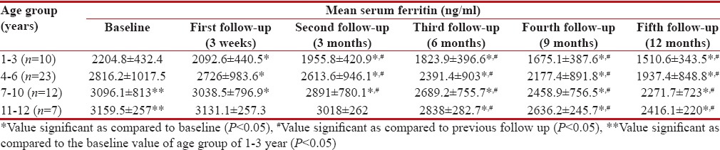 Serum ferritin levels were analyzed in 52 patients (baseline data of three patients were not available). The baseline mean serum ferritin levels were significantly higher in age groups of 7–10 years and 11–12 years as compared to the age group of 1–3 years (P < 0 xss=removed>P < 0 href="https://www.ncbi.nlm.nih.gov/pmc/articles/PMC5582544/table/T3/" target="table" class="fig-table-link figpopup" rid-figpopup="T3" rid-ob="ob-T3" co-legend-rid="" xss=removed>Table 3]. A significant decrease in serum ferritin levels was observed in all age groups at the end of 1 year of treatment with deferasirox.