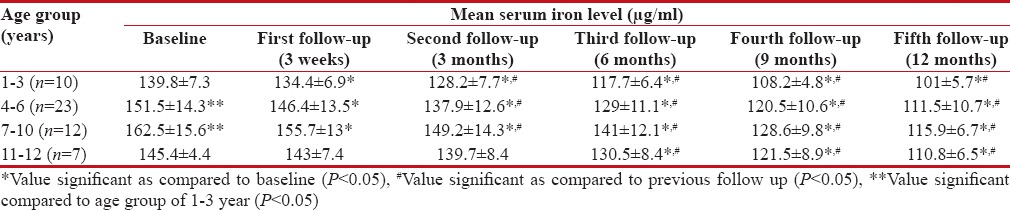 Serum iron levels were analyzed in 52 patients (three patients were excluded as described earlier). The baseline mean serum iron level was higher in patients of age groups of 4–6 years and 7–10 years as compared to age group of 1–3 years (P < 0 xss=removed>P < 0 href="https://www.ncbi.nlm.nih.gov/pmc/articles/PMC5582544/table/T4/" target="table" class="fig-table-link figpopup" rid-figpopup="T4" rid-ob="ob-T4" co-legend-rid="" xss=removed>Table 4].