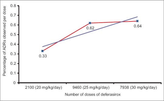 A total of seven ADRs were observed from 2100 doses of 20 mg/kg/day. Fifty-nine ADRs were reported from 9460 doses of 25 mg/kg/day and 51 ADRs from 7938 doses of 30 mg/kg/day of deferasirox. A positive correlation was observed between number of doses prescribed and percentage of ADRs observed (correlation coefficient [r] = 0.998, P = 0.03) [Figure 3].