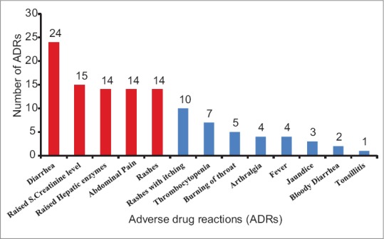 A total of 117 ADRs were observed during the study. These patients received a total of 19,498 doses (in 55 patients) of deferasirox during the study period. Most common ADRs observed were diarrhea (n = 24), raised serum creatinine (n = 15), raised hepatic enzymes (n = 14), abdominal pain (n = 14), and rashes (n = 14) [Figure 2]. No abnormalities were observed on ophthalmological examination at baseline and at end of the study.