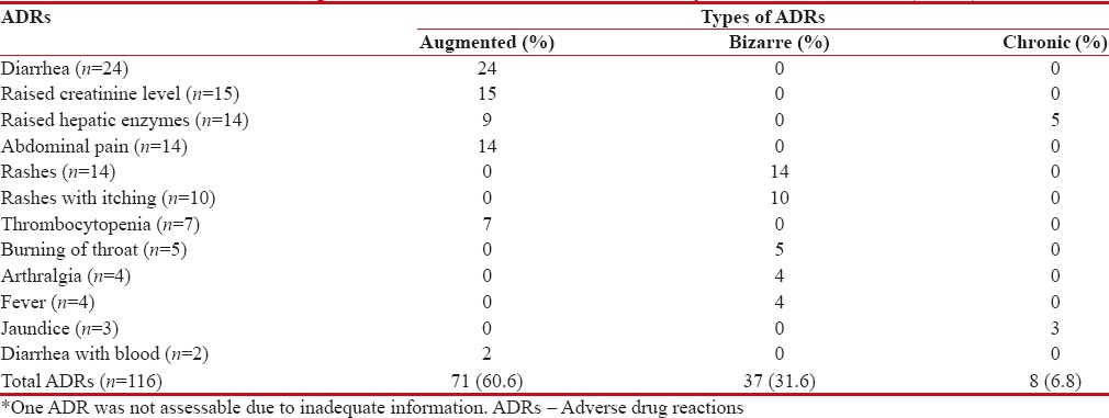 Types of ADRs observed were assessed based on available information on the safety of drug from clinical trials, postmarketing surveillance, and other studies. Majority of the ADRs observed were augmented (Type A) (n = 71, 60.6%), followed by bizarre (Type B) (n = 37, 31.6%) and chronic (Type C) (n = 8, 6.8%) [Table 5]. Tonsillitis occurring in one patient was not assessable due to the lack of adequate information.