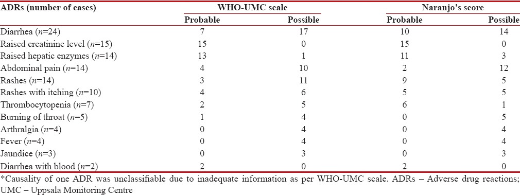 Deferasirox was the probable cause in 51 ADRs, while a possible cause in 65 ADRs as assessed by the WHO-UMC scale. Causality of deferasirox was unclassifiable in one case of tonsillitis. As per the Naranjo's score, deferasirox was the probable cause in sixty ADRs, while a possible causal relation with the drug was found in 57 ADRs including one case of tonsillitis [Table 6].