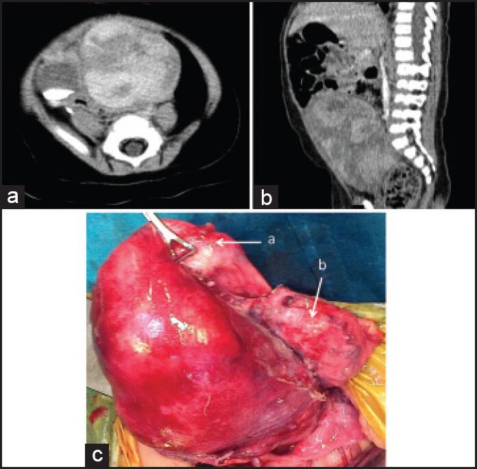| Figure 1:Contrast enhanced computed tomography scan showing the heterogenously enhancing mass arising from pelvis, with contrast in urinary bladder (a and b). Intra-operatively (c), the mass seen arising from the broad ligament, the uterus (a) and urinary bladder (b) separated
