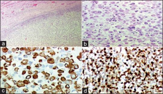 The patient received neoadjuvant chemotherapy (NACT), as per intergroup rhabdomyosarcoma study group (IRS) IV protocol (vincristine, actinomycin and cyclophosphamide). The post NACT CECT scan showed a stable disease. An exploratory laparotomy performed revealed a lobulated mass of 10 cm × 5 cm × 5 cm [Figure 1]. The mass had a pedicle and was seen to be arising from the left broad ligament. The uterus and adnexa were separate from the mass, pushed to the right side. The mass was densely adhered to the urinary bladder but could be separated by dissection. The ureters on both sides were separate from the mass. The mass was excised in-toto preserving the uterus and the adnexae. The post-operative course of the patient was uneventful. The final histopathology revealed an ERMS with cut margin negative for tumor. The Immunohistochemistry studies were positive for desmin and myosin [Figure 2]. As per the TNM and IRS staging, our patient was staged as Stage I, Group III, with embryonal histology and thus classified as low risk subgroup.[6] The patient was treated with adjuvant chemotherapy as per IRS IV protocol.