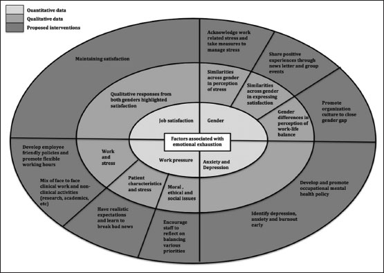 Objectives: The aim of the current study was to explore the associations of emotional exhaustion in oncology clinicians and perceptions of doctors about their work–life balance in a developing country. Methods: The current study used quantitative semi-structured interviews and qualitative in-depth interviews to explore emotional exhaustion and burnout in doctors in a tertiary care cancer center. Sociodemographic details, Maslach Burnout Inventory, and Patient Health Questionnaire were used for the quantitative analysis. Results: Increased work pressure (adjusted odds ratio [AOR]: 5.39, 95% confidence interval [CI]: 2.01–14.47, P < 0 class="i" xss=removed>P < 0 class="i" xss=removed>P < 0 xss=removed class="b" xss=removed>Conclusion: Increased work pressure, reduced job satisfaction, and increased affective symptoms contribute to emotional exhaustion in oncology clinicians, and the risk increases especially in female doctors. Having gender-sensitive and employee-friendly policies will likely help in having a nurturing work environment.