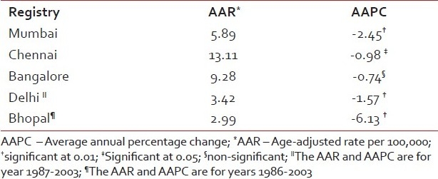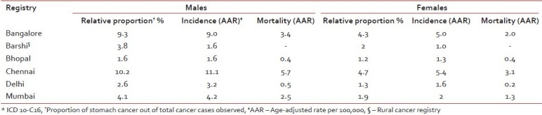 The data obtained from the National Cancer Registries indicates that gastric cancer is a leading problem in North-eastern and Southern states of Indian subcontinent [Tables [Tables11 and and2].2]. The rates for gastric cancer in North-eastern registries are higher than rest of the countries. However, this should be interpreted with caution as these registries are in initial years of registry operation, and it has been demonstrated that registries might include prevalent cases in their initial years. The age-adjusted incidence rate of stomach cancer in males varies widely among registries, highest being 11.1 per 100,000 in Chennai compared to 1.6 per 100,000 in Bhopal.[4] Similar to trends of stomach cancer globally, Indian registries have also observed statistically significant decreasing trend over the last 20-year period [Table 3].