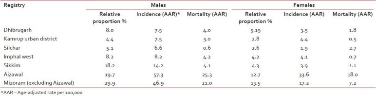 Age-adjusted (world) incidence and mortality rates of gastric cancer and its relative proportion in population-based cancer registries from North-Eastern region of India. Years: 2003-2004