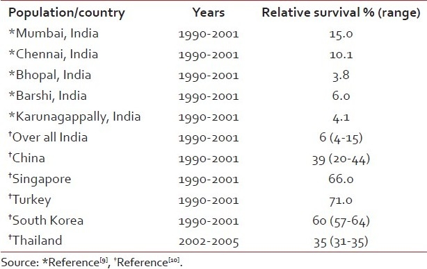 The mortality figures from Indian registries suffer with problem of under-reporting because of problems in registration of death and in reporting of cause of death. The Mumbai registry with comparative reliable mortality (owing to stringent implication of Coroners Act) data reports decline in mortality rate from 2.7 for females and 4.8 for males in 1994[5] to 1.7 for females and 1.8 for males in 2005.[6] The population-based survival studies, another indicator of health infrastructure and success of treatment, indicate that despite improvement in treatment modalities, prognosis from stomach cancer remains to be poor. The 5-year survival rate for stomach cancer is approximately 20%. Survival rates are higher in countries which have screening programs that lead to early detection and where distal cancer (which has a better prognosis) predominates.[7] The 5-year relative survival for stomach cancer in India from 1992 to 1994 was observed to be 6%.[8] The 5-year age standardized relative survival in the age group of 0-74 years for different Indian registries and its comparison with other Asian registries is shown in Table 4.