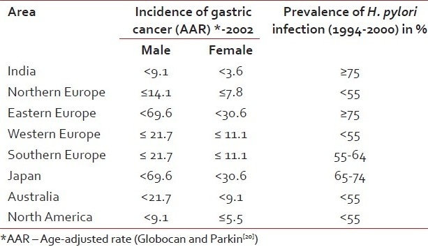 Another study from Northern India reported the prevalence of H. pylori as high as 74% in controls as compared to 68% in gastric cancer cases.[18]